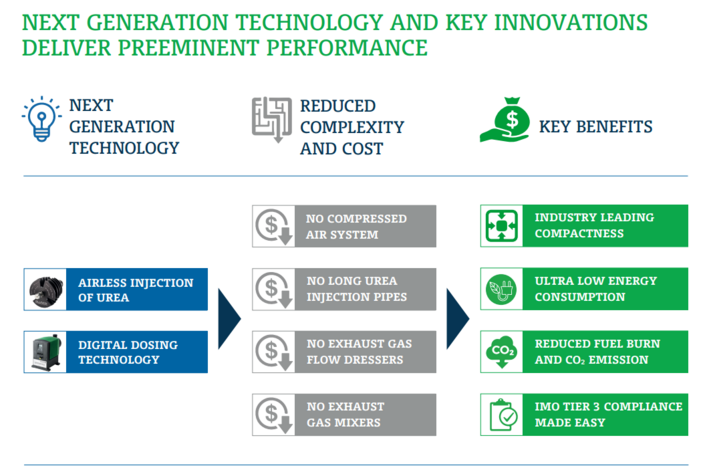 For marine and offshore vessels: NOx reduction better than IMO 2016 requirements The Digital Airless Multipoint (DAM) SCR System utilises high precision digital dosing of urea to achieve high NOx reduction without ammonia slip. This gurantees NOx reduction of up to 97% and NOx emissions lower than the strict IMO 2016 requirements. For stationary emitters: NOx reduction meets strictest legislation The DAM SCR System utilises high precision digital dosing of urea to achieve high NOx reduction without ammonia slip. This guarantees NOx reduction of up to 97% and NOx emissions lower than the strictest legislation for stationary emitters. No extra fuel consumption Unique to the DAM SCR System, it has no need for compressed air for urea spray, long urea injection pipes, exhaust gas flow dressers and exhaust gas mixers. These facts give a SCR system with very low back-pressure and energy usage resulting in no extra fuel consumption. Easy and low cost installation - low weight and highly compact The DAM SCR System is designed to be low in weight and highly compact compared to traditional SCR systems. Key to achieving these goals is the use of a low weight honeycomb catalyst rather than a heavy traditinal extruded catalyst. Also, the system integrates silencer and catalyst, so no extra space is needed compared to the existing/traditional silencer, which can be removed/eliminated. Finally, the absence of compressed air, long urea injection pipes, exhaust gas flow dressers and exhaust gas mixers gives a very compact and low weight system. Broad exhaust temperature and engine load operating range Thanks to the use of digital dosing, the DAM SCR System has an ultra high, dynamic response to engine load changes, and the honeycomb catalyst used has a broad operating temperature range and high resistance to SOx in the exhaust gas. This ensures reliable, consistent and high NOx reduction across a broad operating range and enables NOx reduction for applications with frequent engine load changes. Robust system with low maintenance requirements The system has been designed with robust components, many tested by leading engine manufacturers and proven to automotive standards. The airless injection nozzles are extremely robust, long-term tested and free from electronics and moving parts. Compared to traditional extruded catalyst elements, which are prone to cracking when exposed to sudden temperature changes, the DAM SCR System's honeycomb catalyst elements have a high tolerance to changes in temperature due to changes in engine load. | | Maintenance intervals are longer or the same as for the engine. The catalyst elements are guaranteed 16,000 operating hours at 100% effectiveness. After this, their effectiveness will gradually be reduced by roughly 8% effectiveness for each 10,000 operating hours. Typically, a complete change out of catalyst elements is needed for every 30,000-40,000 operating hours. A complete change out of catalyst elements can be done in less than 6 hours thanks to the easy access design through the top of the catalyst housing. Remarkable noise attenuation tailored to your requirements The DAM SCR System provides remarkable noise attenuation, thanks to the design of the catalyst housing and reactor. On current installations, a noise attenuation of 35 dB(A) has been readily achieved through the catalyst housing and reactor alone. Taylor made modular silencing units are available to be integrated into the catalyst housing, so that specific noise frequencies can be targeted and eliminated. No adverse effects of running without urea dosing The DAM SCR System will not be damaged nor will it affect engine performace, when running without dosing urea. This is important should the urea supply be exhausted or when choosing not to reduce NOx. In either case, the vessel can keep operating with no adverse effects. Potential for 6-9% saving in fuel and CO2 emission Today's engines compromise on fuel efficiency to keep NOx emissions moderate; by tuning the engine and thereby producing more NOx, which subsequently can be removed by the DAM SCR System, the fuel savings potential can be achieved. Highly corrosion resistant The DAM SCR System is designed to operate in the toughest environments, and its construction in AISI 304 and AISI 316 grade stainless steel ensures high corossion resistance. Proven technology tested by leading engine manufacturers The SCR DAM technology was originally developed by DANSK TEKNOLOGI for truck and bus applications and has been extensively tested in cooperation with leading engine manufacturers. From 2011, the SCR DAM technology will be fitted on next generation busses and trucks from leading manufacturers. Chosen by the Royal Danish Navy Following succesful results with the first prototypes of the DAM SCR Systems for Marine Applications, the Royal Danish Navy has chosen to equip their entire DIANA-class of vessels with DAM SCR systems. |